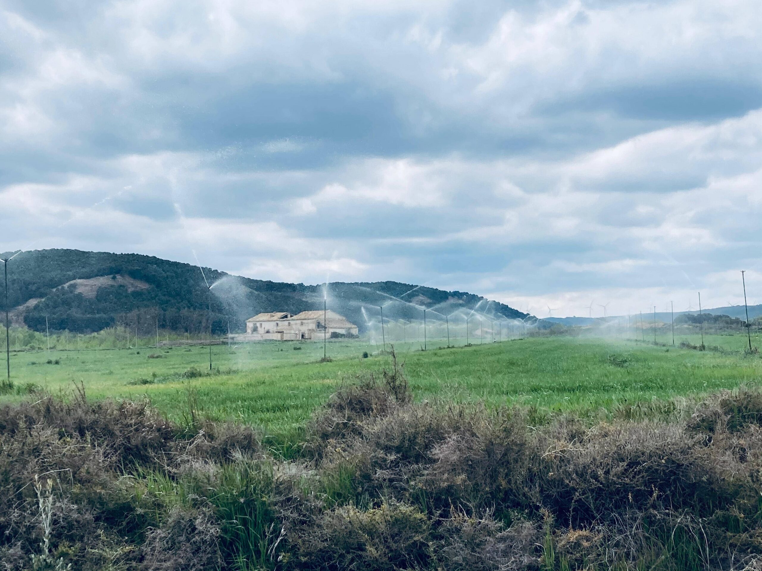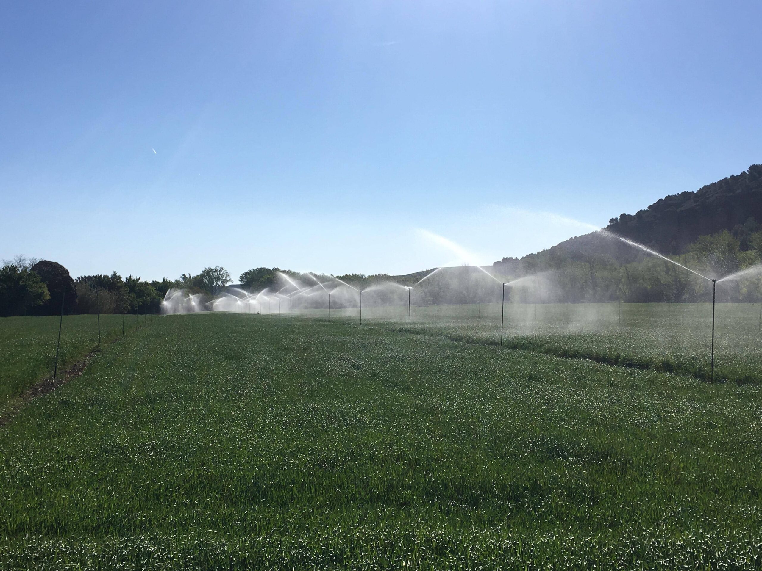 una finca de regadío equipada con sistemas de aspersión que aprovechan el agua de forma eficiente.